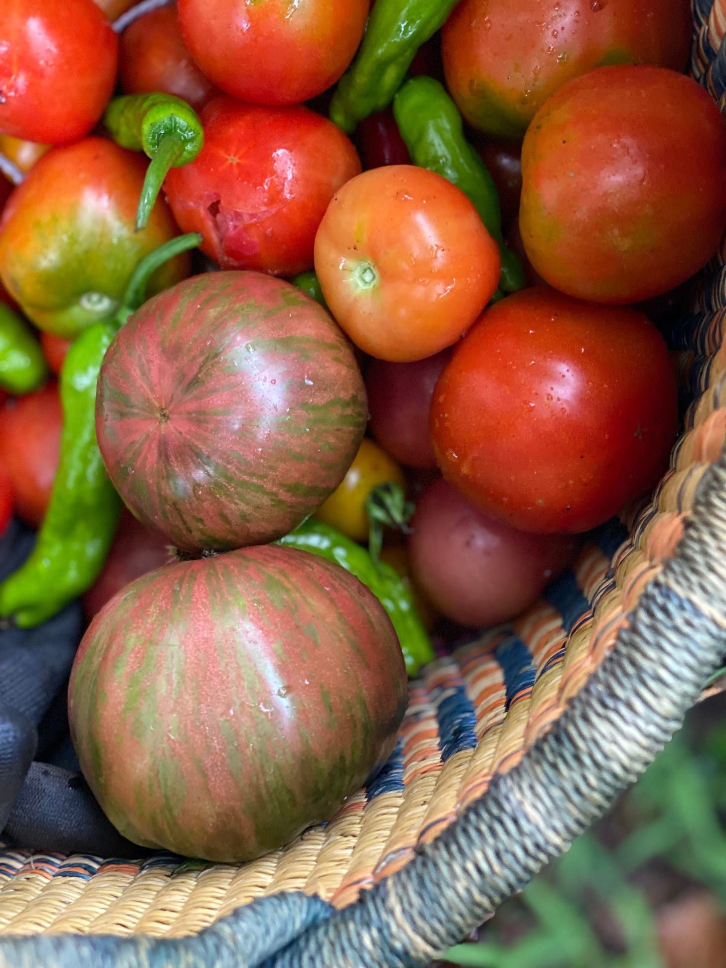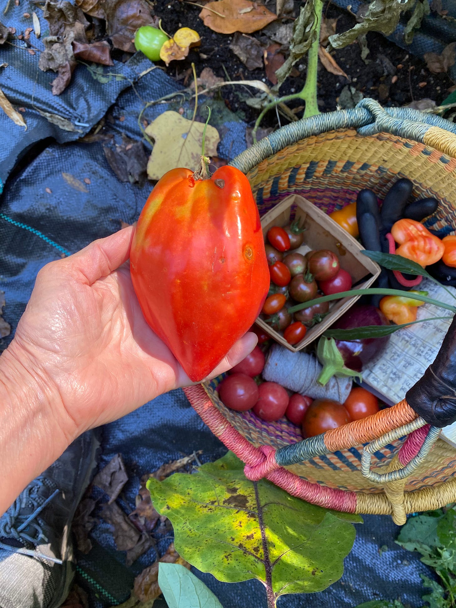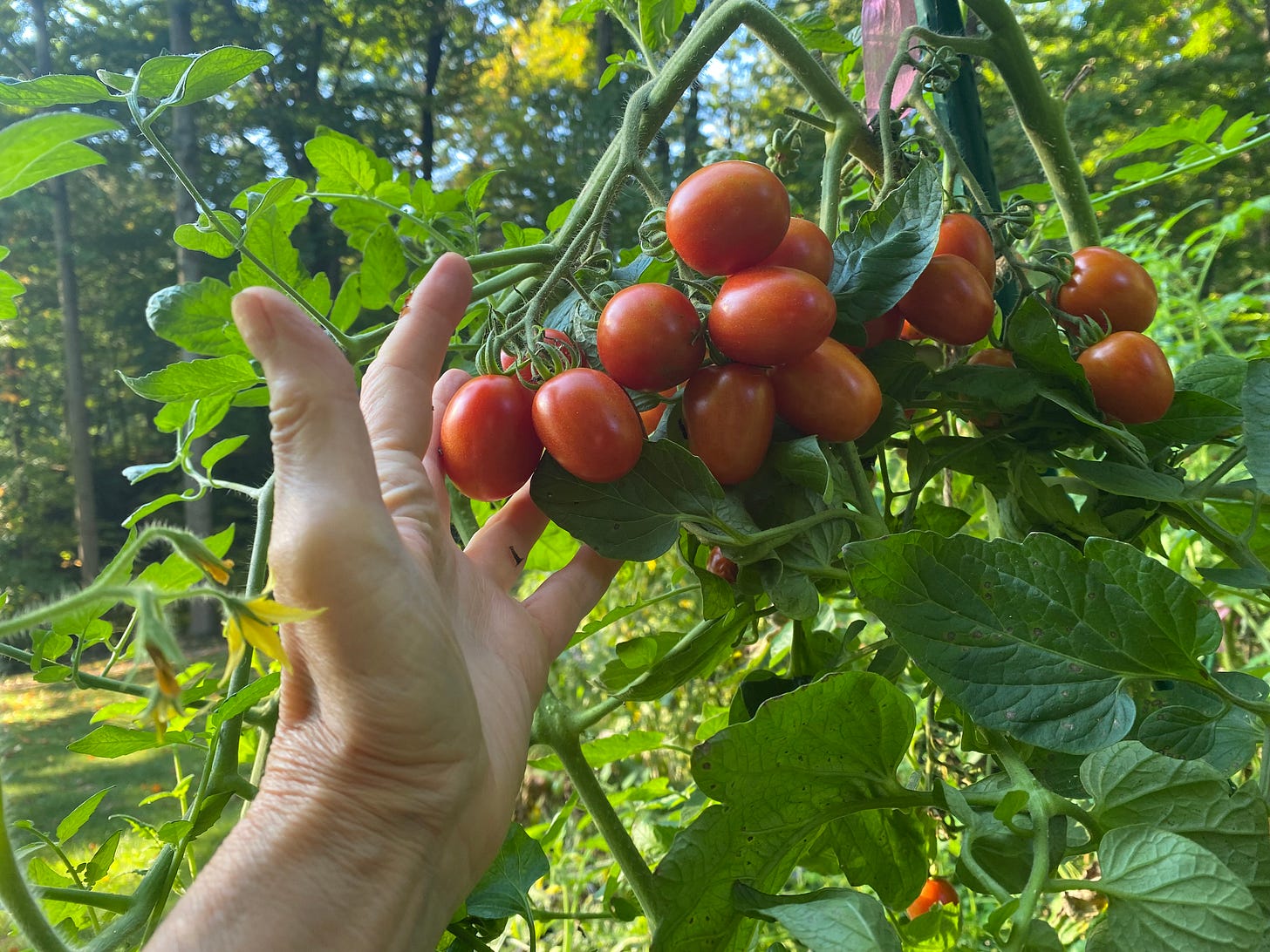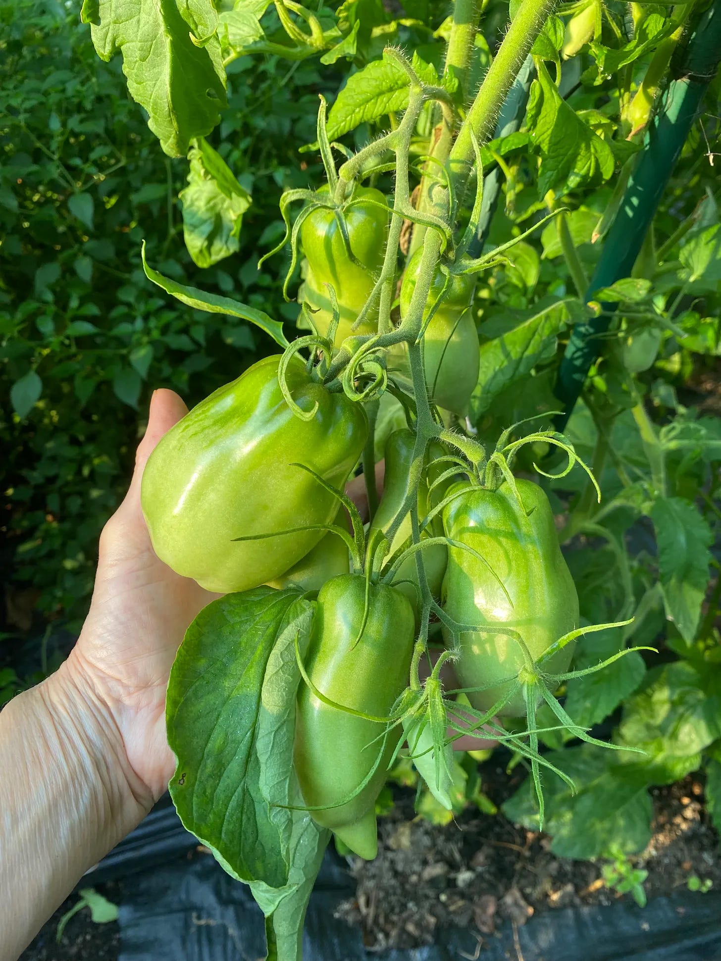 The blue beech tomato was new to us in 2025, and where has it been all our growing life? This isn’t one of those trick pictures like fisherfolks produce to make the fish look larger.